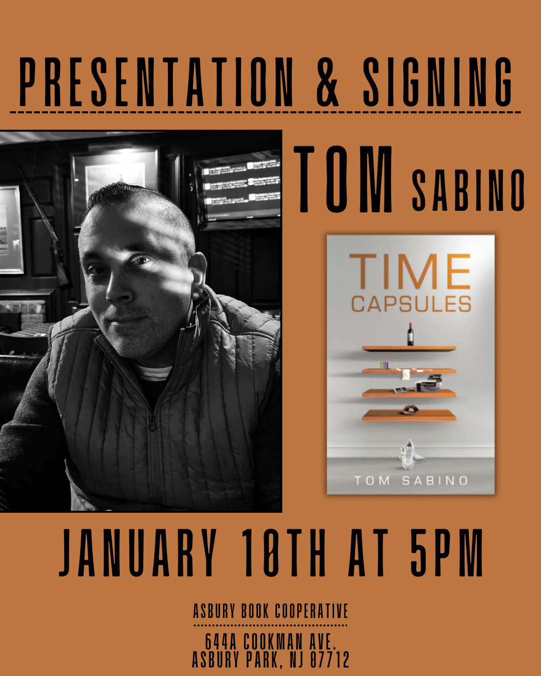 Asbury Book Cooperative 644A Cookman Ave, Asbury ParkPresentation & Signing: Time Capsules by Tom Sabino ✍🏻 Join us for a presentation and signing by Tom Sabino, author of TIME CAPSULES. Admission to the event is free. Hope to see you in the shop!