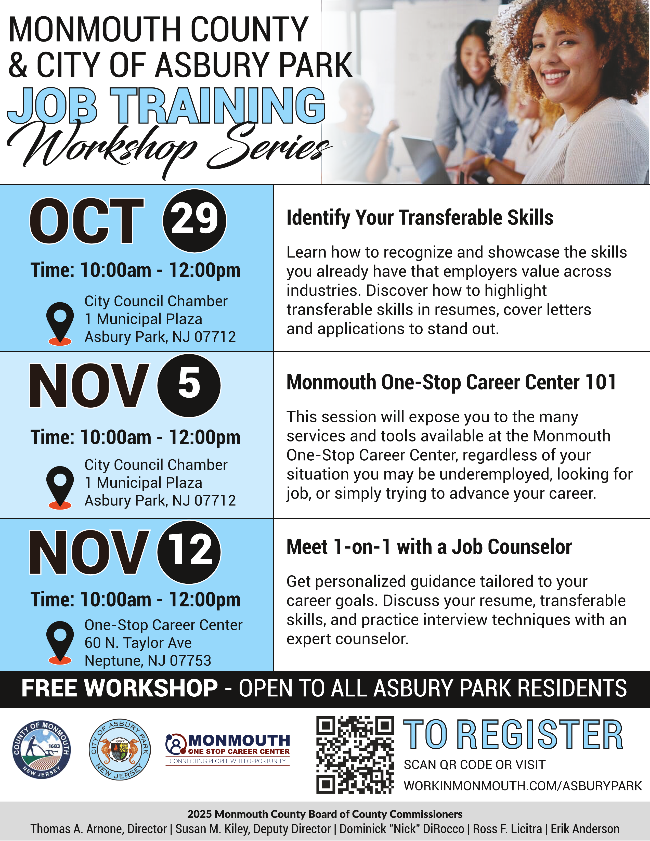 Nov 5 10:00 am - 12:00 pm Monmouth County & City of Asbury Park JOB TRAINING Workshop Series 🛠️ Asbury Park City Council Chambers 1 Municipal Plaza, Asbury Park Event Details Get Directions
