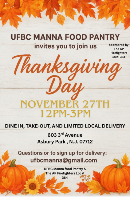 Nov 27 12:00 pm - 3:00 pm UFBC Manna Food Pantry Thanksgiving Day! 🍁🍗🍴 UNited Fellowship Baptist Church 603 3rd Avenue, Asbury Park Event Details Get Directions